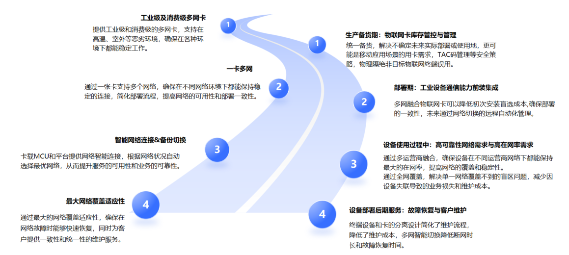 相对于传统单网物联网卡,多网融合物联网连接解决方案对行业用户的物联网应用全生命周期都带来便利和价值。